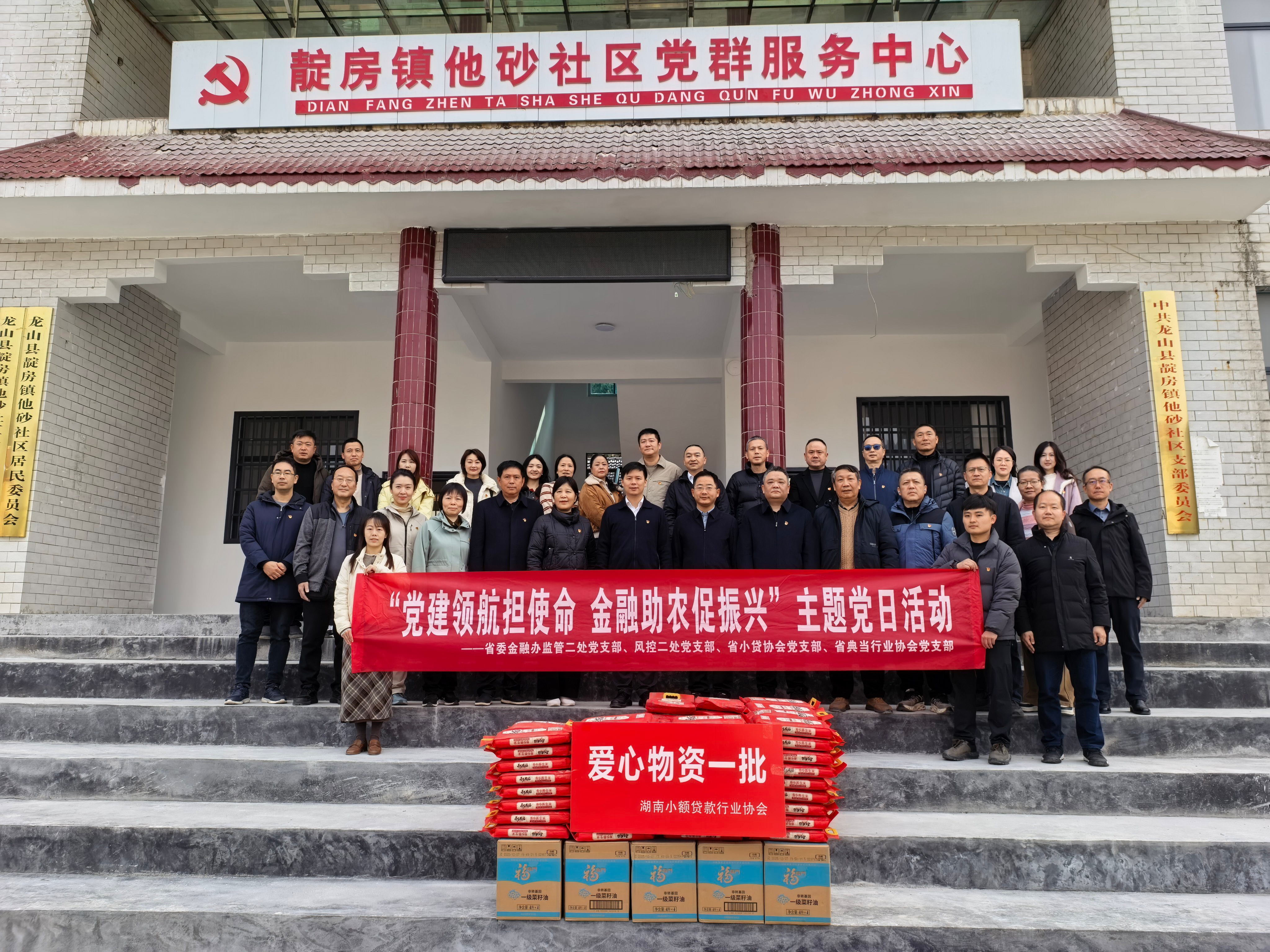 为深入贯彻落实乡村振兴战略部署,深化党建与金融服务融合发展,近日,省委金融办牵头组织湖南省小额贷款行业协会、湖南省典当行业协会及相关企业代表,赴湘西州龙山县开展调研帮扶活动。活动紧扣红色教育铸魂、实地调研破题、精准帮扶暖心主线,既传承革命精神,又聚焦基层需求,为龙山县巩固脱贫成果、推进乡村振兴注入强劲金融动力。